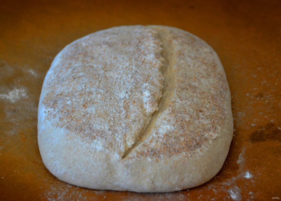Разогрейте духовку до 250 градусов в режиме "верх-низ". Подготовьте хлеб к выпечке. Аккуратно выложите его на лист для выпечки "швом вниз".
