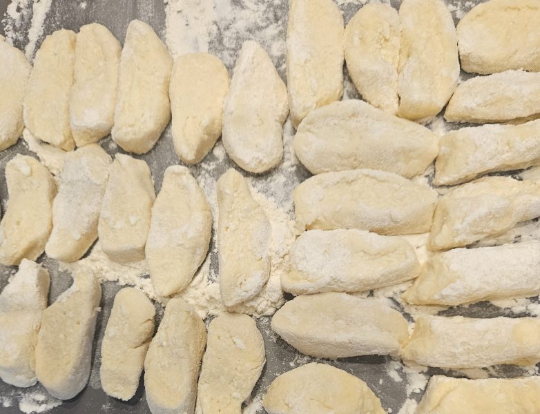 3. На несколько порций его разделим, стол посыпем мукой, порции раскатаем колбаской приблизительной толщины два-три сантиметра. Чтобы к столу не прилипало тесто, должно быть достаточно муки.