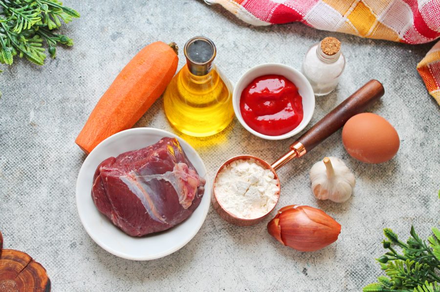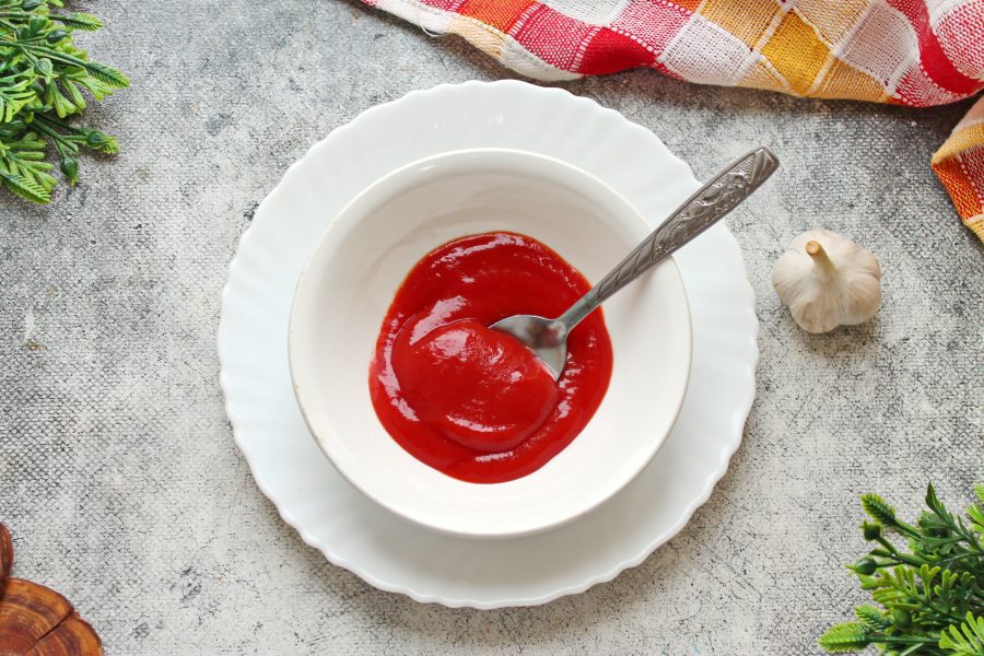 Для соуса в сотейник выложите томатную пасту, добавьте растительное масло и разбавьте бульоном после приготовления баранины. Поставьте на средний огонь и доведите до кипения. Снимите соус с огня, посолите по вкусу, добавьте измельченный чеснок, перемешайте и полностью остудите.