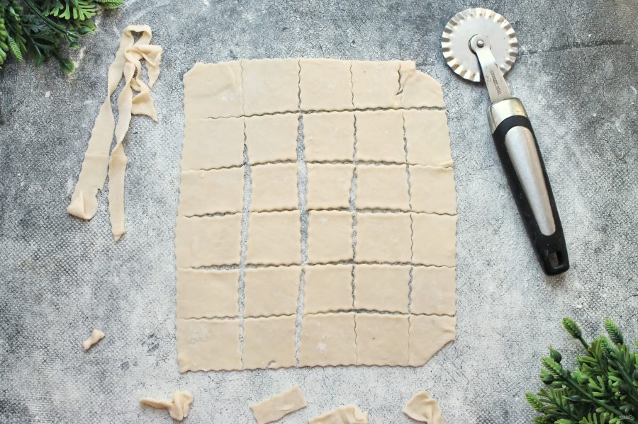 Рабочую поверхность немного посыпьте мукой. Тесто разделите на 2-3 части, так будет легче работать. Возьмите одну часть, остальные держите покрытыми пленкой, раскатайте в прямоугольник толщиной 1-2 миллиметра. Разрежьте тесто на квадратики примерно со сторонами 4 на 4 сантиметра. Поступите так со всем тестом.