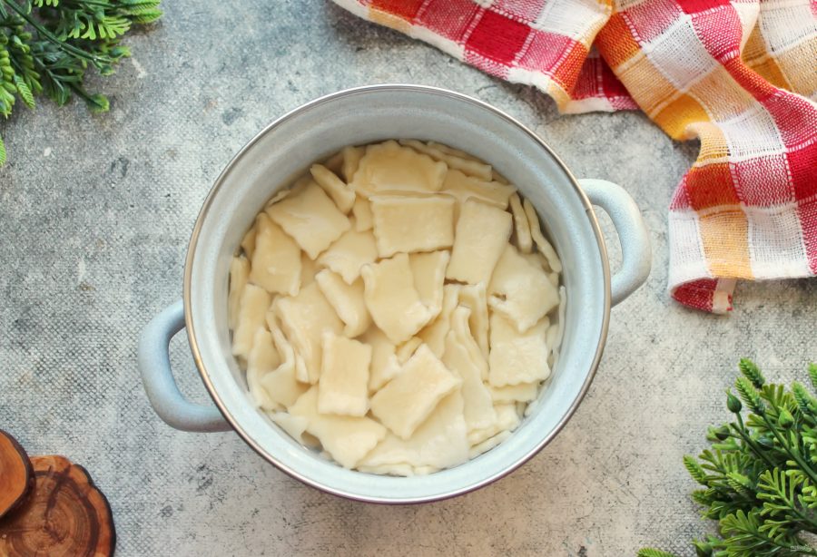 В кастрюлю налейте воду, посолите и доведите до кипения. Выложите хинкал в воду и варите в течение 1-2 минут, после того как они всплыли. Достаньте хинкал из кастрюли шумовкой, добавьте растительное масло и перемешайте. Это позволит квадратикам не слипнуться между собой.