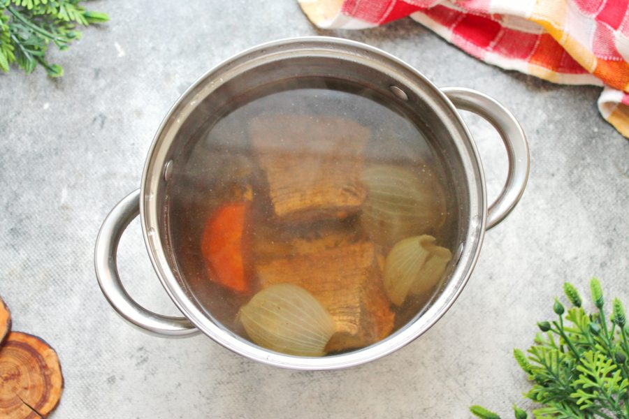 Для начала нужно приготовить бульон и мясо для подачи хинкала. Баранину выложите в кастрюлю и влейте холодную воду, поставьте на средний огонь и доведите до кипения. Снимите пену сверху, убавьте огонь. Добавьте в кастрюлю репчатый лук, морковь и не сильно посолите. Варите на медленном огне, не закрывая крышкой, в течение 1-1.5 часов, до готовности мяса. Баранину выньте, порежьте на куски, а бульон процедите. Мясо покройте, чтобы оно осталось горячим.