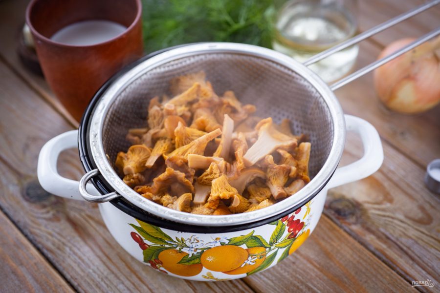 Подготовьте все необходимые продукты. Лисички тщательно переберите и промойте. Лук репчатый почистите.