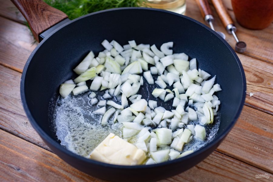 Сковороду поставьте на средний огонь, растопите в ней сливочное масло, добавьте к нему растительное. Выложите в сковороду лук.