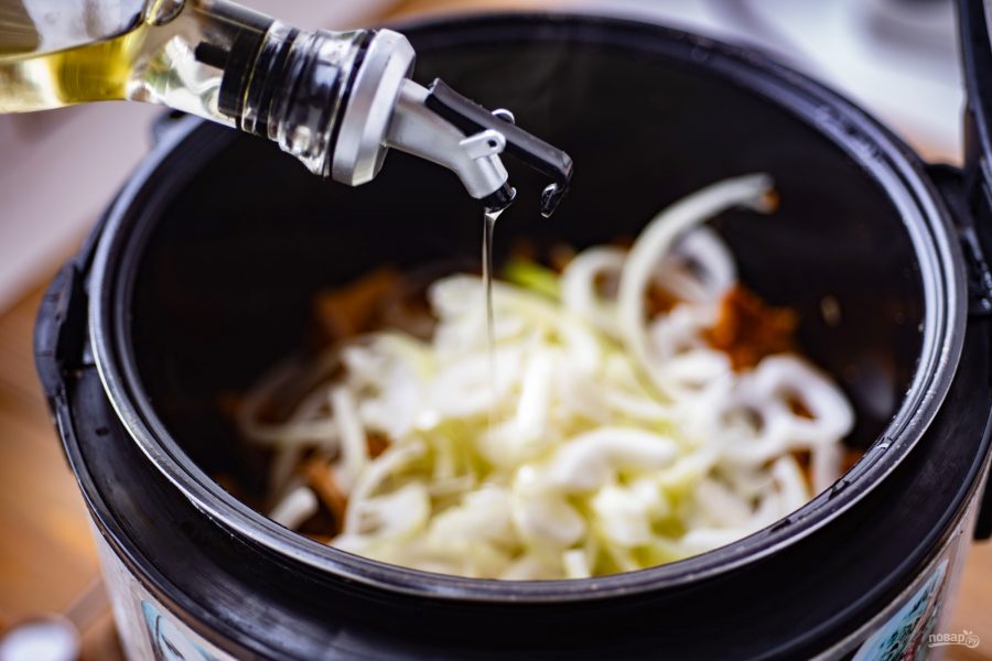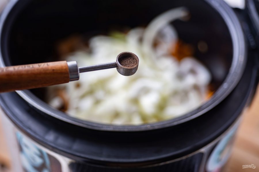 Добавьте молотый перец. Перемешайте, закройте крышку мультиварки и продолжайте
