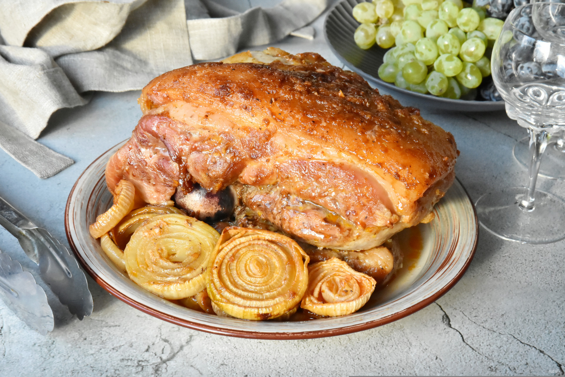 За час до готовности снимите фольгу и продолжите запекание. Готовое мясо выложите на блюдо, тут же разложите запеченный лук и подайте к столу. Получившийся после запекания мяса соус, слейте в соусник и подайте отдельно.