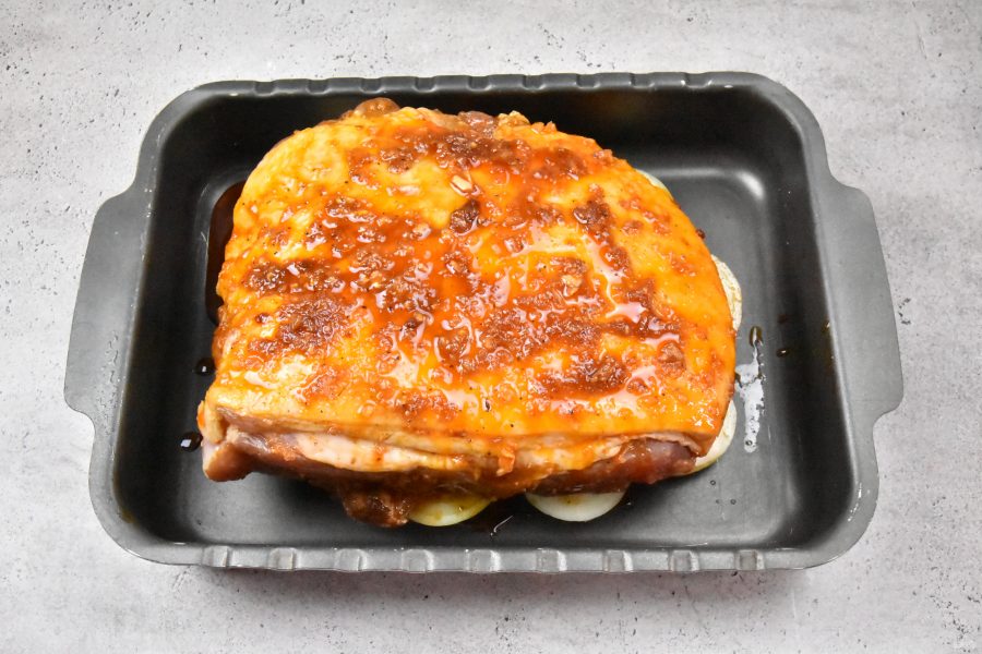 Свиную лопатку хорошо промажьте приготовленным маринадом со всех сторон. Накройте посуду полиэтиленовой пленкой и оставьте мясо мариноваться на 6-8 часов.