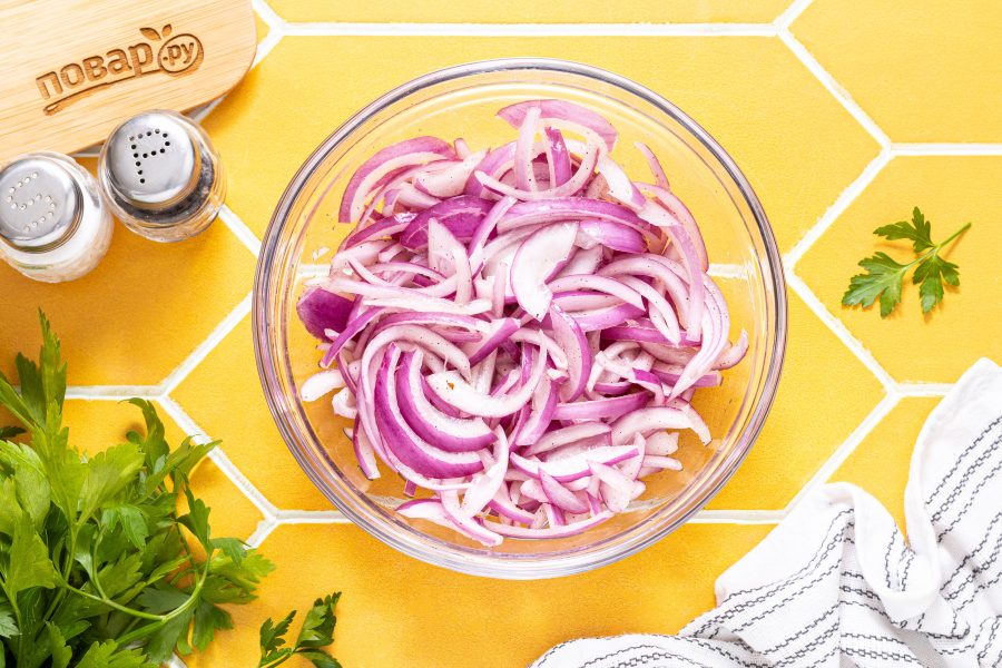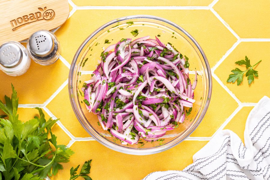 Лук пустит сок и станет мягче за это время. Его можно сразу подавать, а можно убрать в плотно закрывающийся контейнер и хранить в холодильнике до 3 дней.