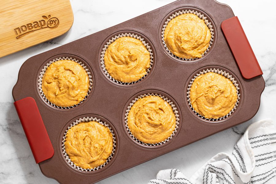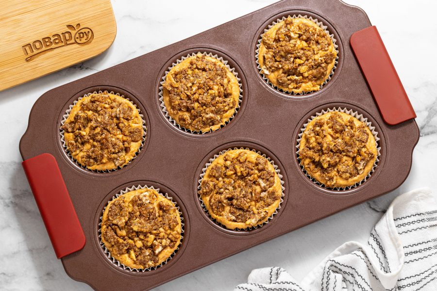 Добавьте сверху штрейзель. Немного вдавите его в тесто для кексов. Выпекайте кексы в заранее разогретой до 200 градусов духовке 20-25 минут. Готовность проверяйте шпажкой или сухой зубочисткой. Если кексы кажутся сыроватыми, то накройте фольгой и готовьте еще 5-10 минут.