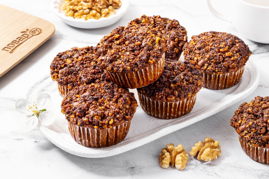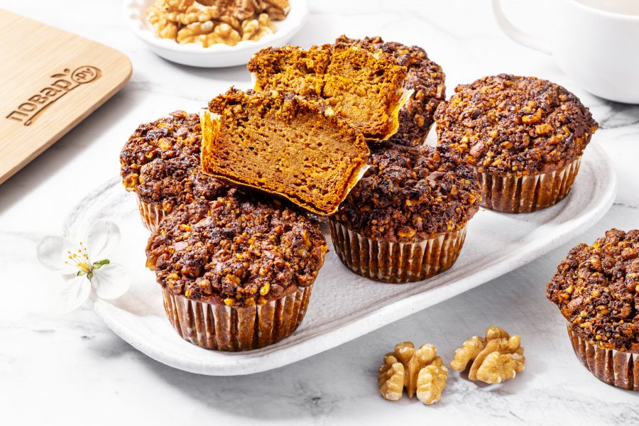 Ниже я расскажу подробнее, как приготовить маффины с бататом. Муку из полбы можно заменить на обычную пшеничную, кленовый сироп любым другим жидким подсластителем, а кокосовый сахар тростниковым или белым. Приготовить такие маффины также можно с тыквенным пюре. Маффины получаются очень вкусными, мягкими, но с хрустящей верхушкой из сахара и грецких орехов.Состав / Ингредиенты: