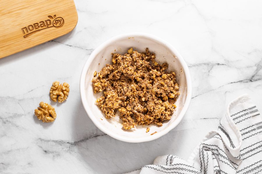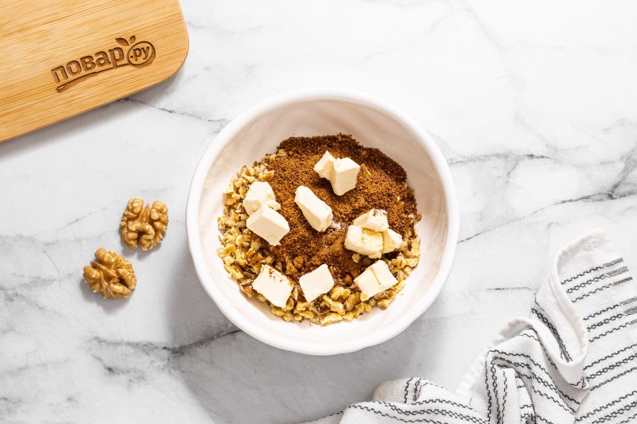 Для штрейзеля в небольшой миске смешайте крупно порубленные грецкие орехи, корицу, соль и сахар. Добавьте сливочное масло нарезанное кубиками.