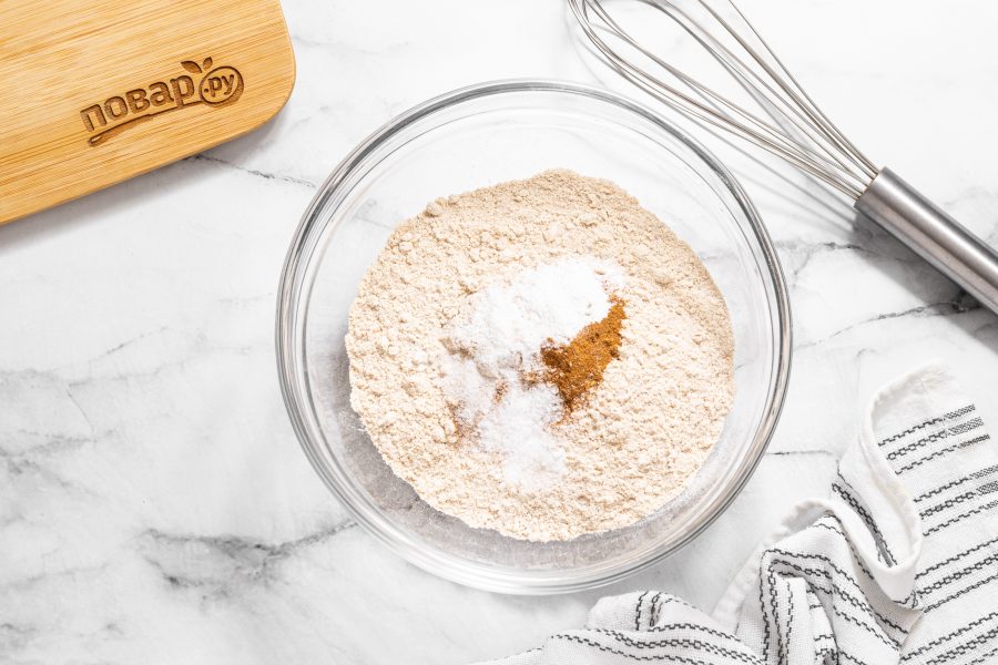 В глубокой миске смешайте полбяную муку, ванильный сахар, корицу, разрыхлитель, пищевую соду и морскую соль.