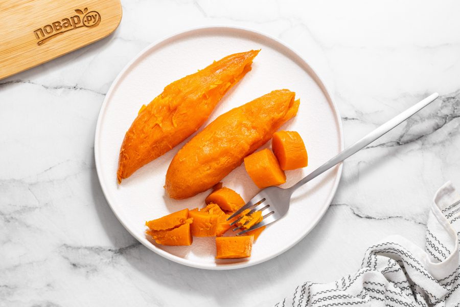 Батат заранее запеките в духовке до мягкости. Время приготовления будет зависеть от размера батата. Я готовила около 1 часа при температуре 190 градусов.