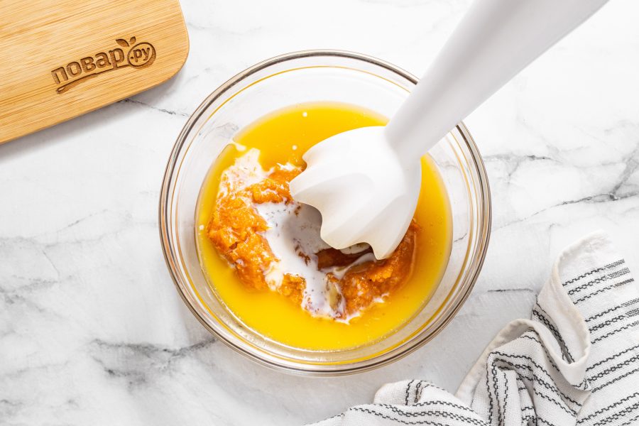 В другую миску добавьте пюре из батата, кленовый сироп, растопленное сливочное масло и молоко. Блендером пробейте до однородности.