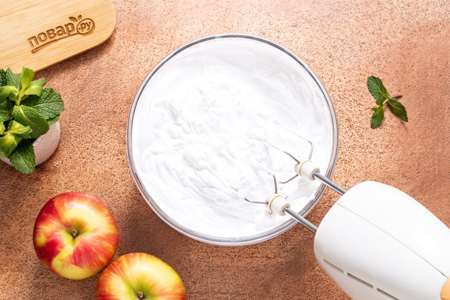 Взбейте сливки с сахаром до устойчивых пиков.