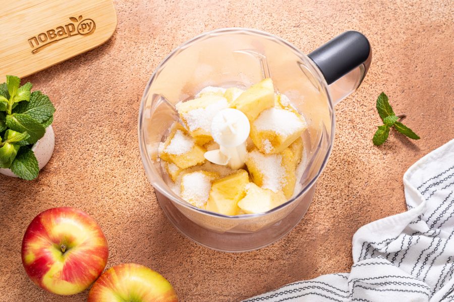 Соедините в блендере яблоки, растительное масло и сахар. Измельчите до однородности.