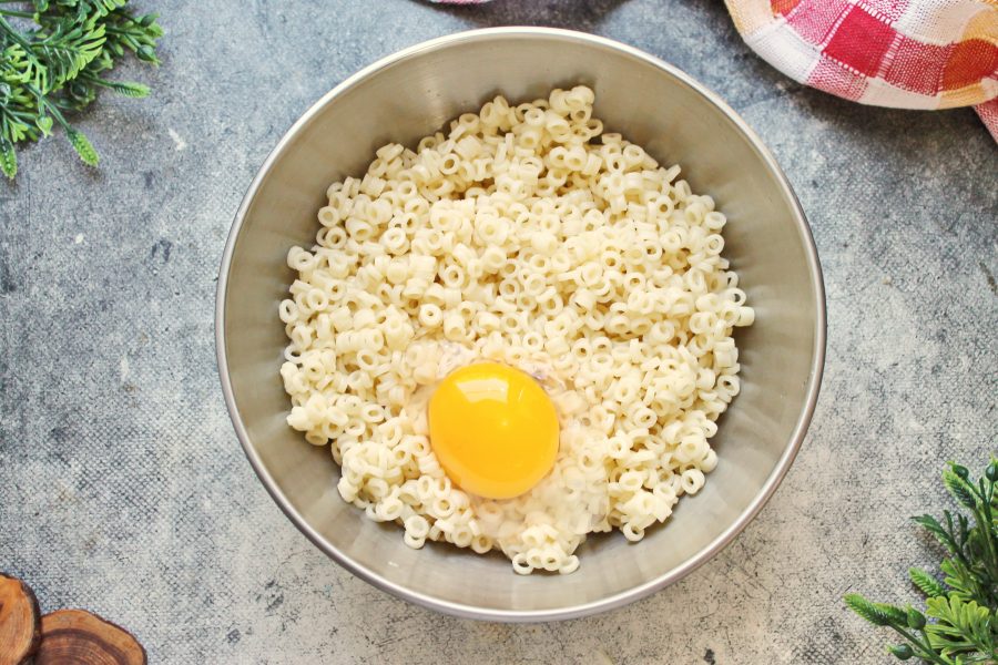 В остывшие макароны вбейте одно яйцо и хорошо перемешайте.
