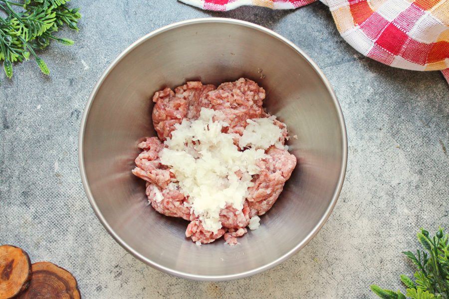 Включите духовку разогреваться до температуры 180 градусов. Репчатый лук почистите, сполосните и измельчите любым удобным способом. В миску выложите мясной фарш и добавьте репчатый лук.