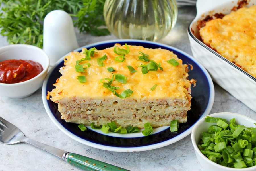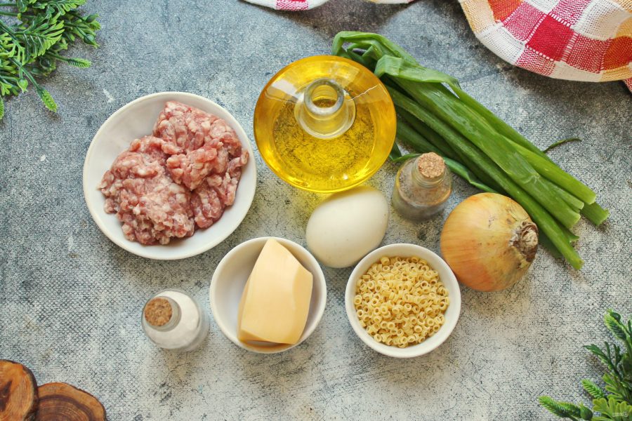 Подготовьте все необходимые ингредиенты для приготовления макаронной запеканки с фаршем.