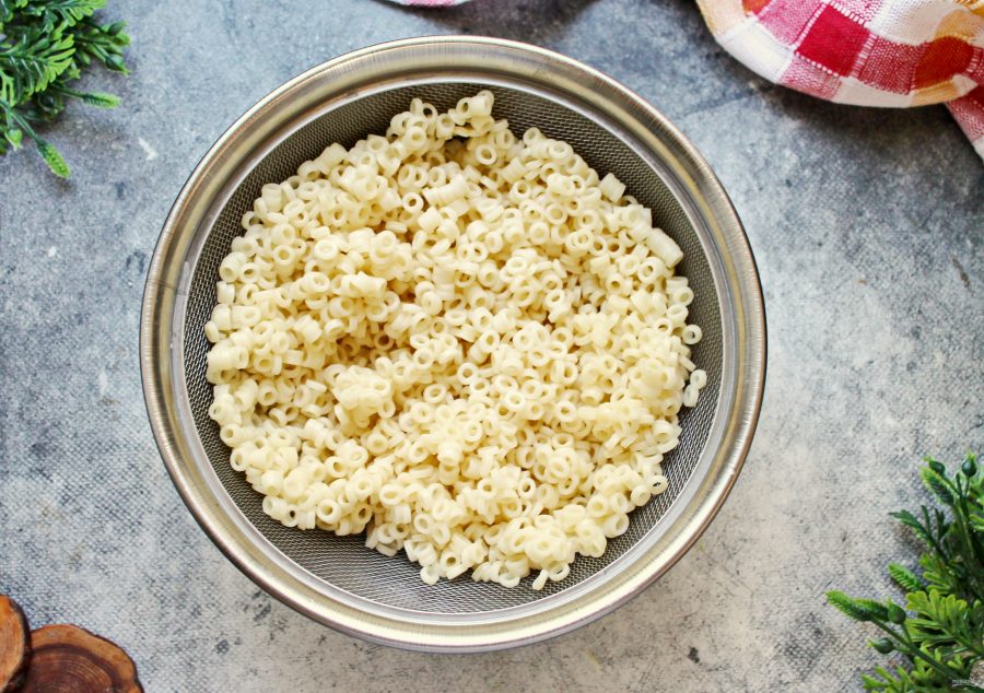 В кастрюлю налейте 500 мл. воды, посолите и доведите до кипения. Всыпьте макароны, перемешайте, чтобы не слиплись. Отварите макароны до полуготовности, то есть на 2 минуты меньше, чем указано в инструкции. Макароны можно любые, но лучше не очень крупные, чтобы запеканка держала форму после нарезки. Откиньте макароны на сито, не промывайте и дайте жидкости полностью стечь.