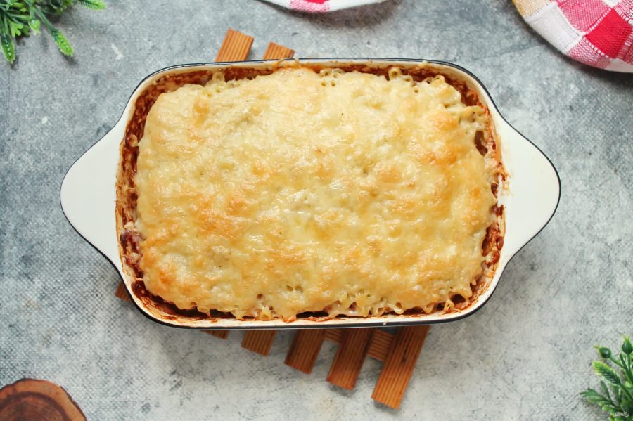 Выложите снова 1/3 макарон, следующим слоем оставшийся фарш и сверху выложите оставшиеся макароны ровным слоем. Форму с запеканкой покройте фольгой и поставьте в горячую духовку. Готовьте запеканку в течение 25 минут при температуре 180 градусов.