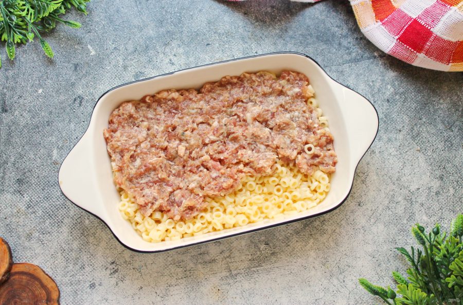 Форму для запекания смажьте растительным маслом и выложите 1/3 макарон, разровняйте. Сверху ровно выложите половину мясного фарша.