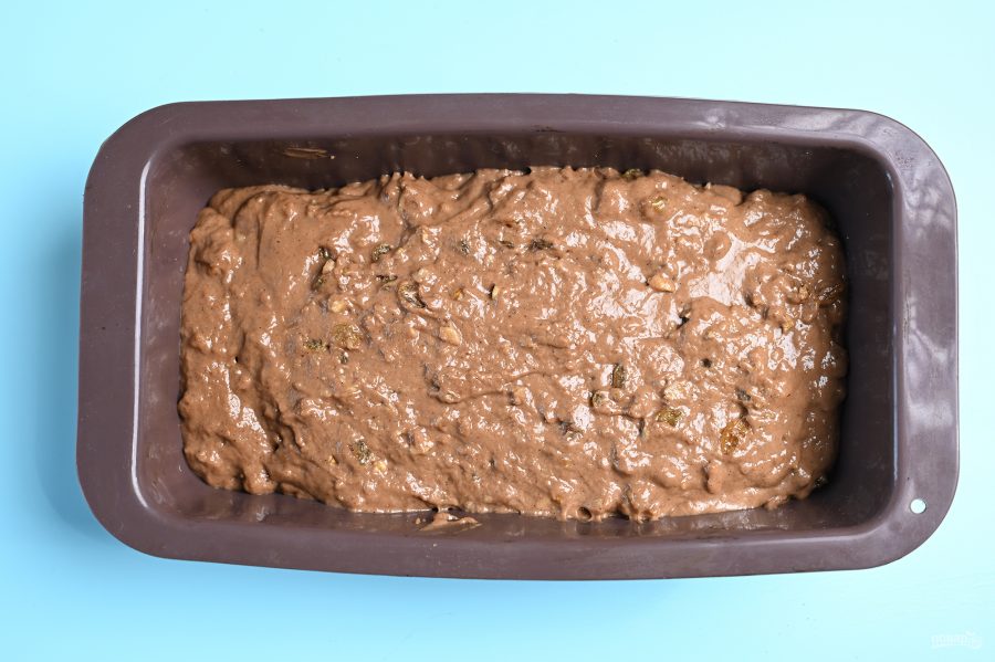 Вмешайте изюм и орехи в тесто до равномерного распределения по всей массе.