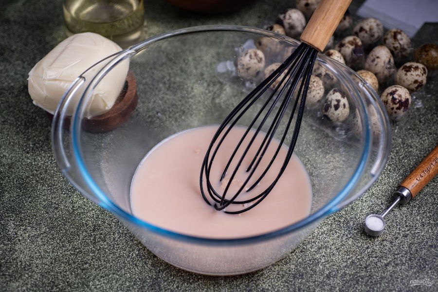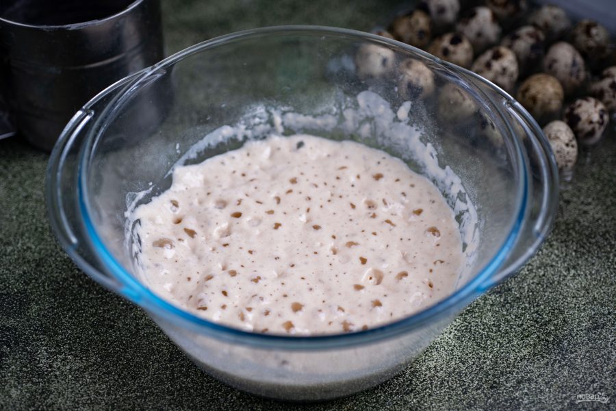Венчиком вмешайте муку и в результате должна получиться однородная смесь — опара. Миску с опарой накройте кухонным полотенцем и оставьте в теплом месте на кухне на полчаса.