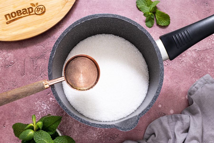В кастрюлю с толстым дном насыпьте сахар. Влейте воду и не перемешивайте! Дождитесь, пока сахар естественным образом полностью намокнет.