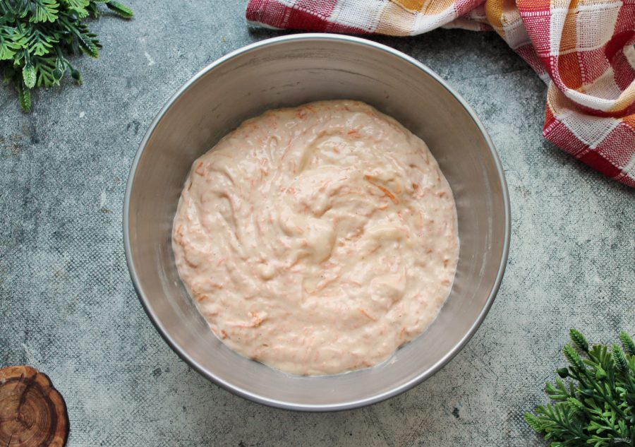 Порциями всыпайте муку со специями и осторожно перемешивайте лопаткой снизу вверх. Тесто должно остаться воздушным и без комочков муки.