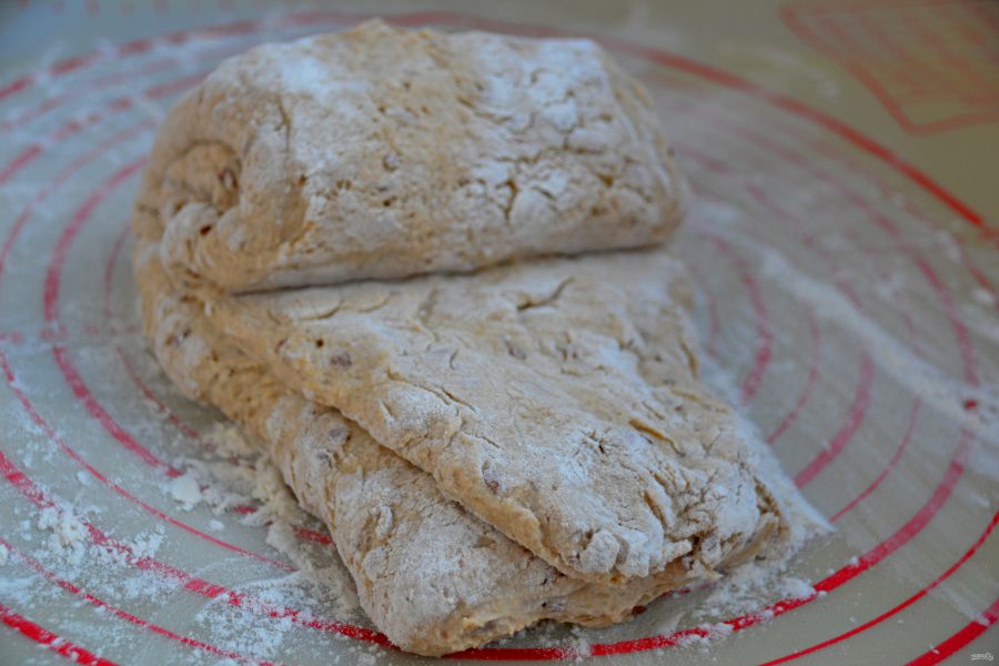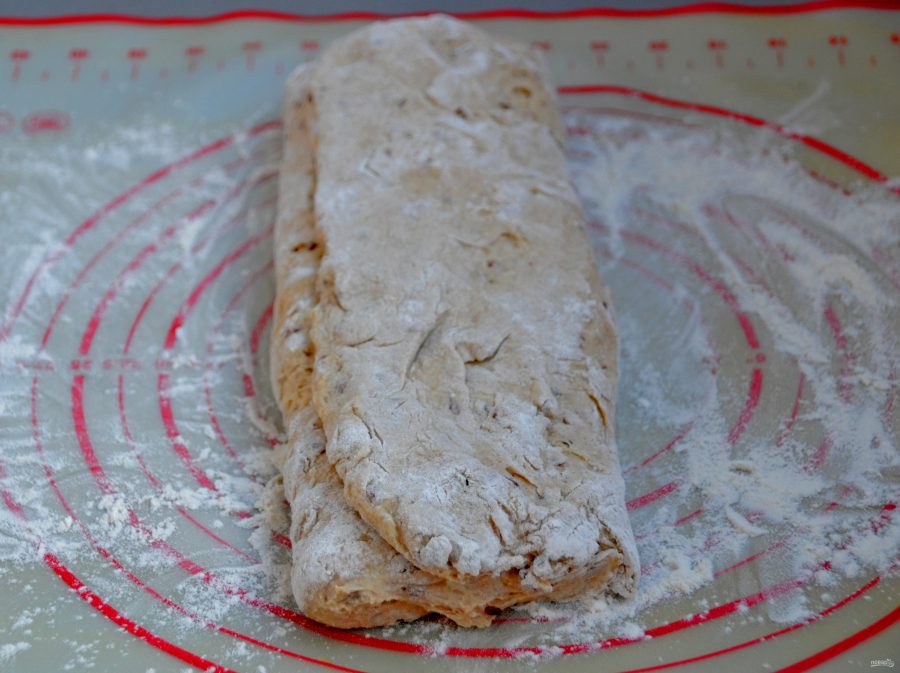 Замесите руками тесто, вымешивать не надо, просто соедините все ингредиенты. Накройте, оставьте при комнатной температуре на 10-12 часов.