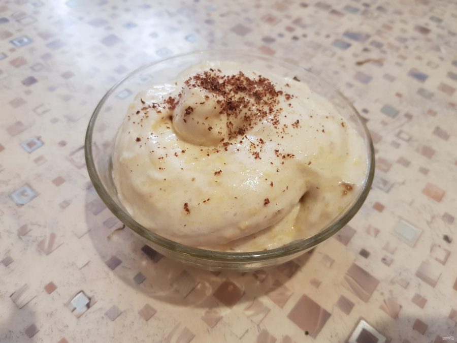 При помощи кондитерского шприца (или простой ложки) выдавите мороженое в креманку и украсьте любимым топингом, например, тертым шоколадом.