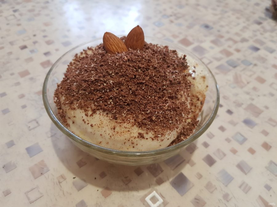Я украсила мороженое тёртым шоколадом и миндальными орехами.