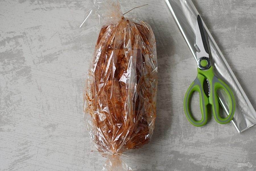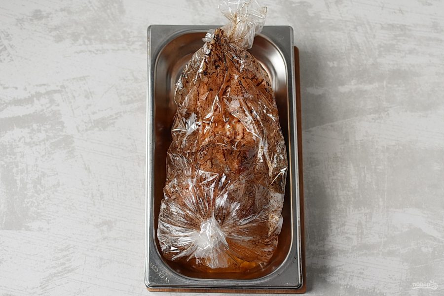 Упакуйте мясо в рукав для запекания и завяжите концы. Уберите мясо в холодильник для маринования на срок от часа до двух суток. Чем дольше маринуется мясо, тем ярче будет вкус и аромат.