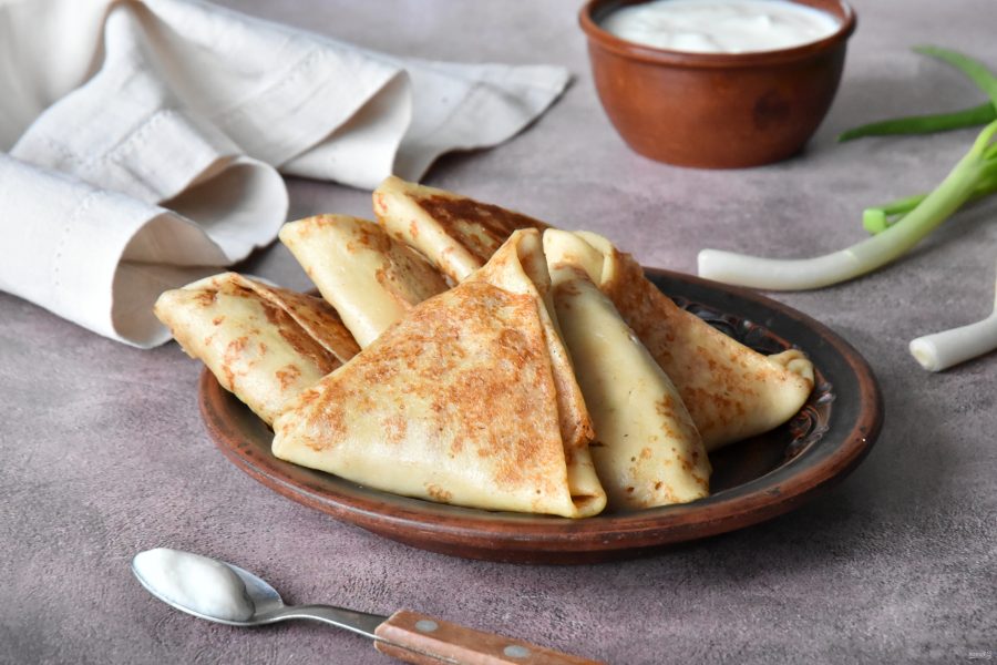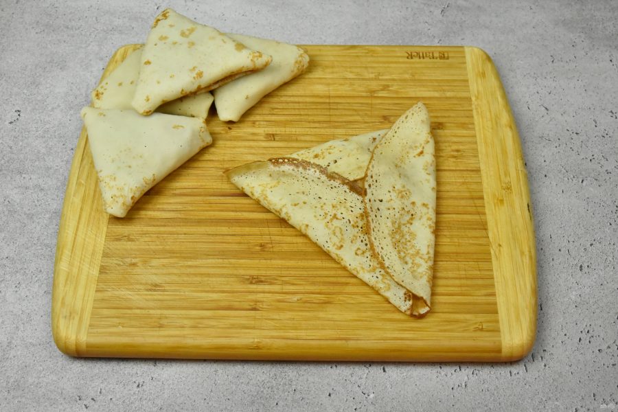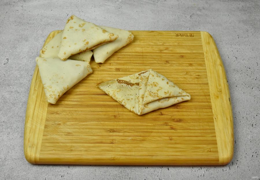 Подверните оба оставшихся края блина на сформировавшийся мини треугольник. Слегка прижмите, чтобы фаршированный блин держал форму.