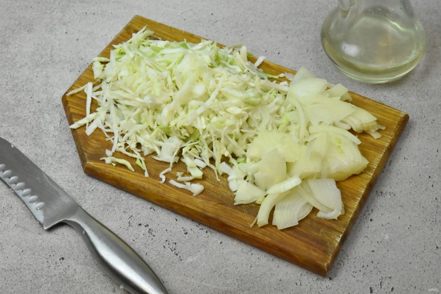 Капусту освободите от верхних листьев и кочерыжки, нарубите ножом или натрите на терке. Лук нарежьте полукольцами.