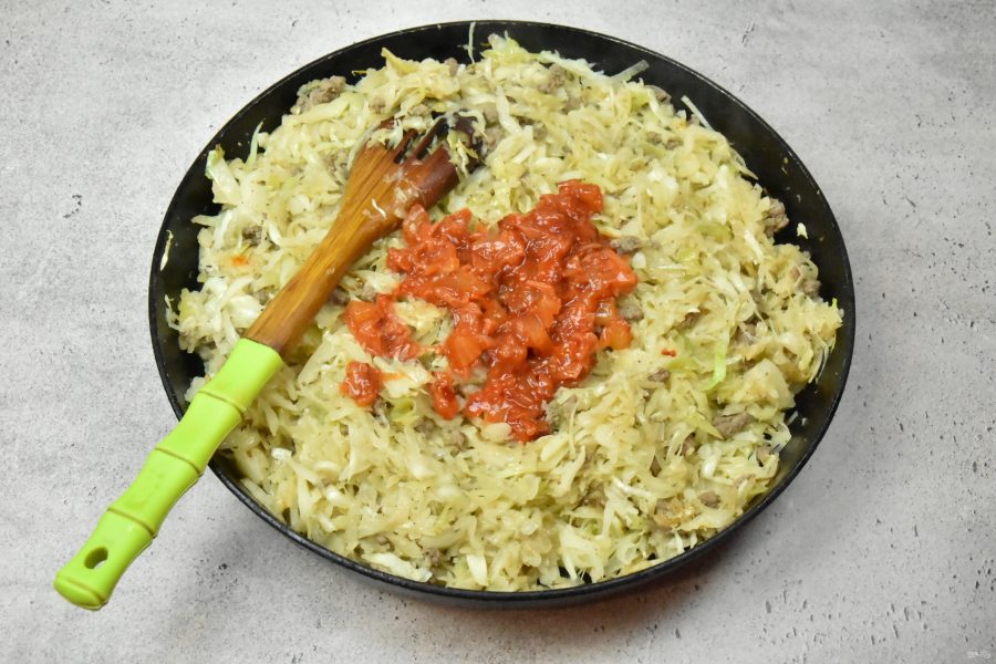 К обжаренной капусте добавьте мясной фарш. Продолжайте жарить до готовности, периодически перемешивая начинку.