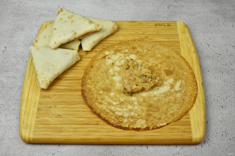 Заверните начинку в блины, приготовленные по вашему любимому рецепту. Завернуть начинку можно несколькими способами. Предлагаю оформить фаршированные блины в виде треугольников. Для этого разложите блин на рабочей поверхности. Выложите порцию подготовленной начинки в форме треугольника.