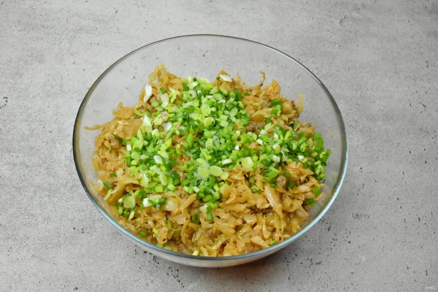 Добавьте соль, черный молотый перец по вкусу. По желанию, для усиления вкуса, в начинку можно добавить горсть квашенной капусты или кимчи.