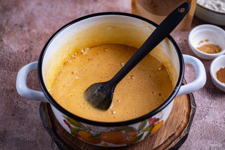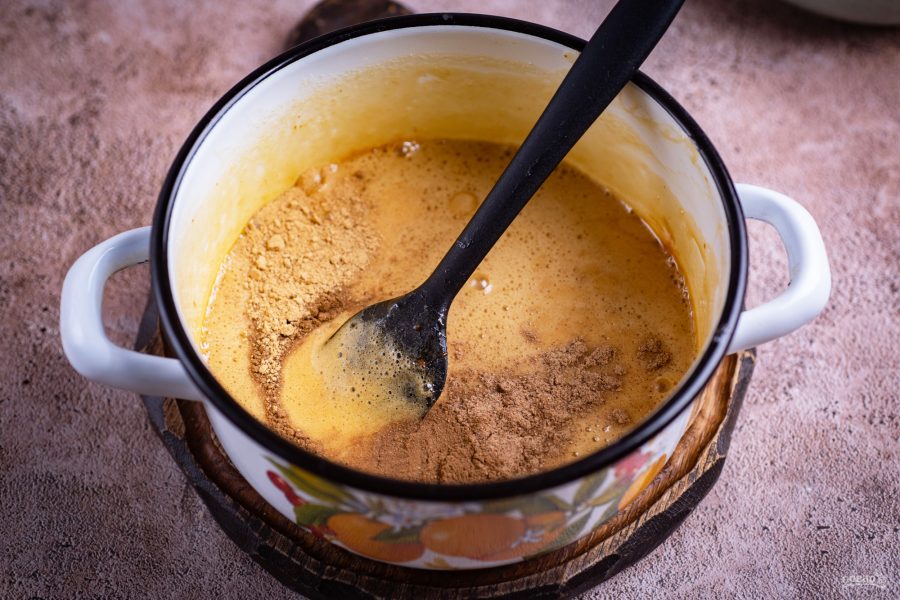 К этой пряной смеси добавьте заранее просеянную муку.