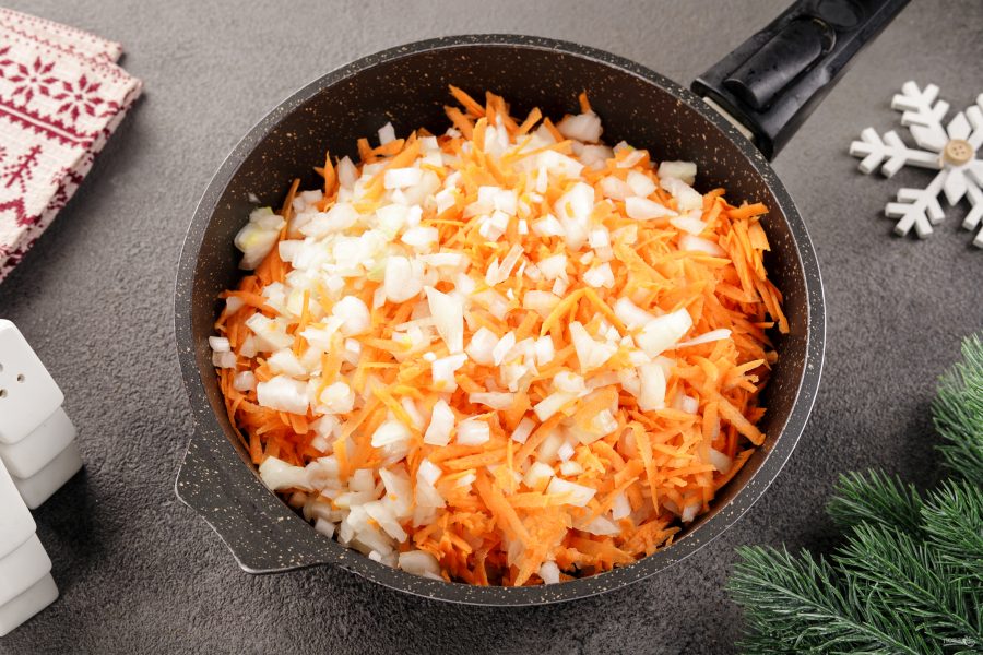 Лук очистите от шелухи, промойте прохладной водой, чтобы он не щипал глаза при нарезке, и нарежьте кубиком. Морковь также необходимо помыть, почистить и натереть на крупной терке. На разогретую сковороду налейте растительное масло. Добавьте лук и морковь, обжарьте их, помешивая, до готовности на среднем огне в течение примерно 7-10 минут.