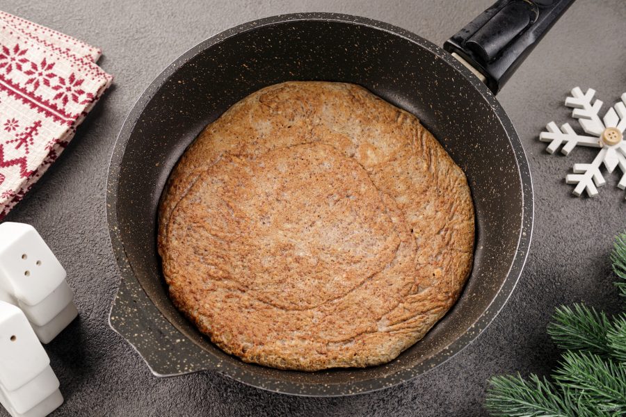 Разогрейте сковороду и смажьте маслом. Диаметр сковороды 18 см. Перемешайте печёночную массу и зачерпните половник теста. Влейте в сковороду. Аккуратно распределите по всему дну. Можно помочь себе ложкой, так как тесто не сильно текучее. Жарьте на среднем огне, примерно, 2-4 минуты, чтобы верхняя сторона блина схватилась.