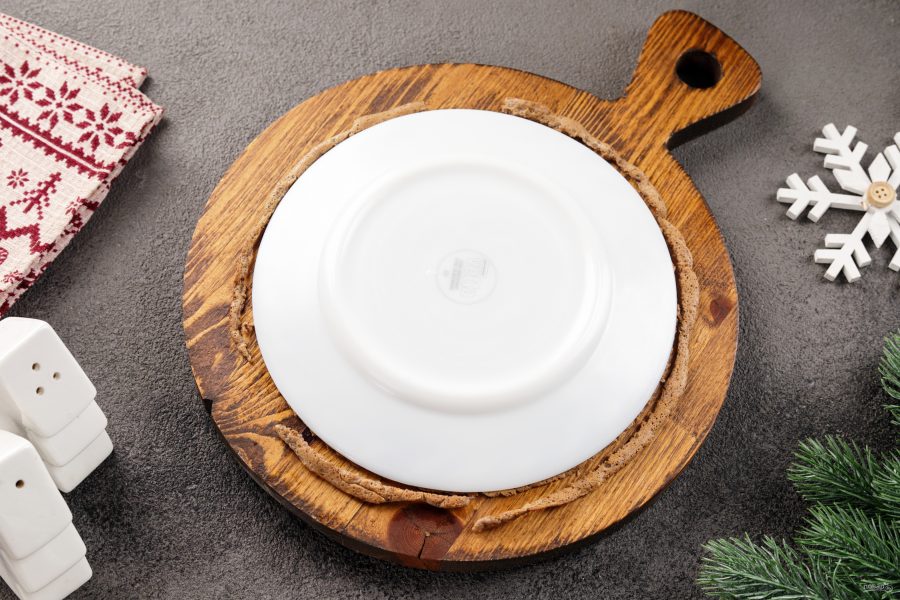 Для формовки печёночного торта я буду использовать формовочное кольцо диаметром 16 см. Можно просто выкладывать блинчики на сервировочную тарелку. На дно кольца опустите печёночный блин.