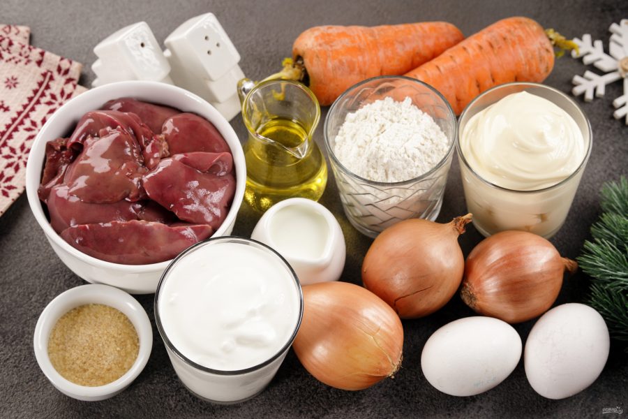 Подготовьте все ингредиенты по списку. Печень вы можете взять любую. Я готовила из куриной. Сметану берите жирную. У меня 20%. Майонез можно сделать самостоятельно.