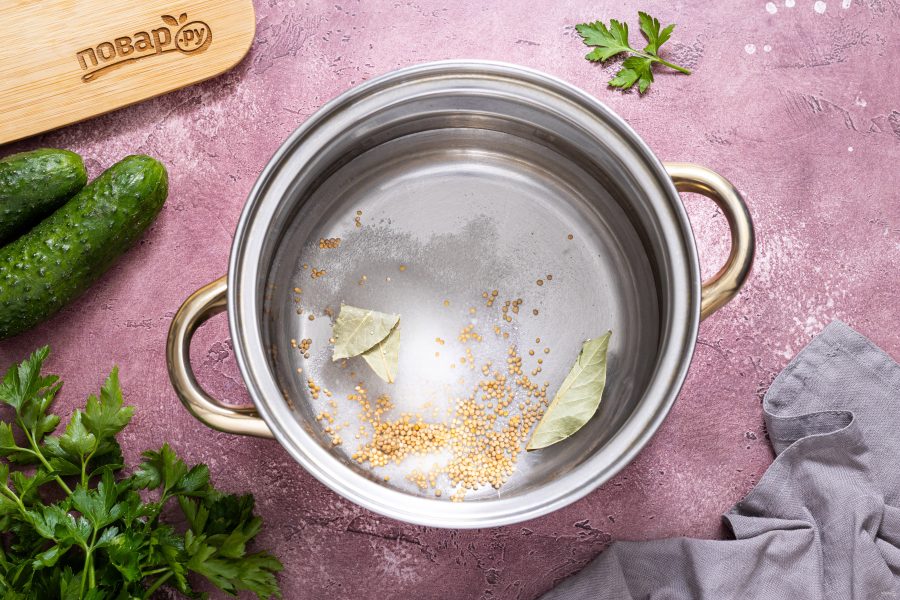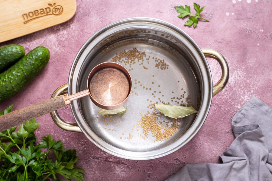 Для маринада вскипятите воду. Добавьте соль и сахар, горчицу зернами и лавровый лист. Проварите, чтобы сахар и соль растворились.