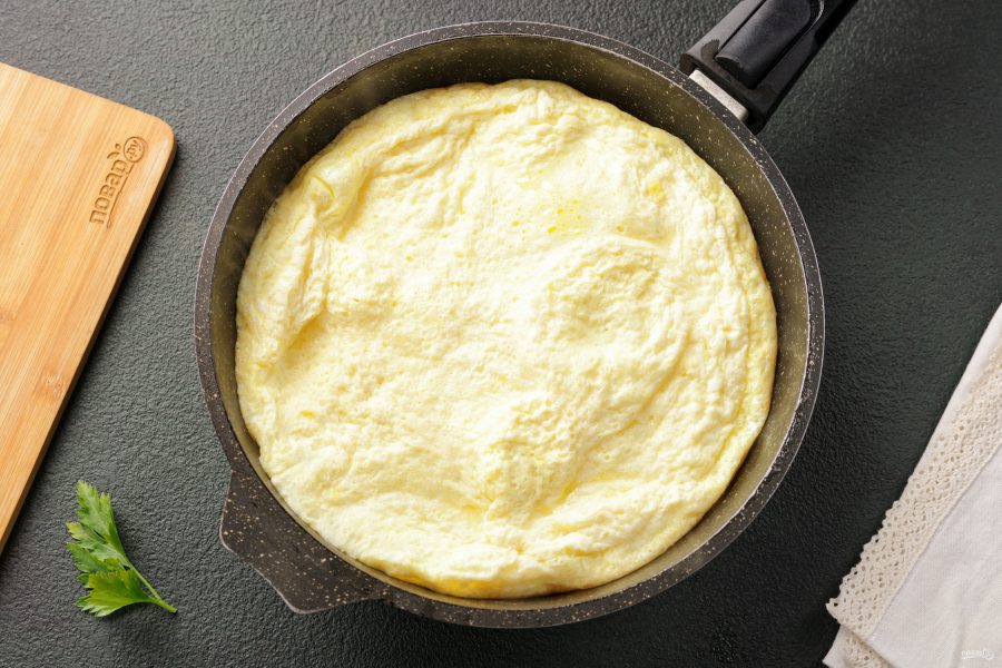 Вылейте в сковороду омлетную массу. Поставьте сковороду на медленный огонь, закройте крышкой и готовьте в течение 12-15 минут. Омлет поднимется, и вся поверхность должна стать плотной.