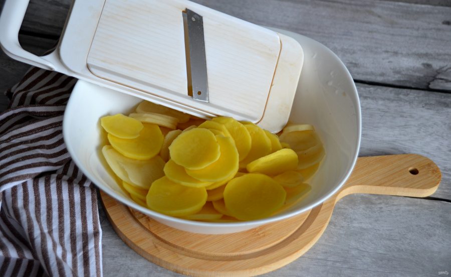 Выложите картофель в форму для запекания, посолите, поперчите, добавьте растопленное сливочное масло.