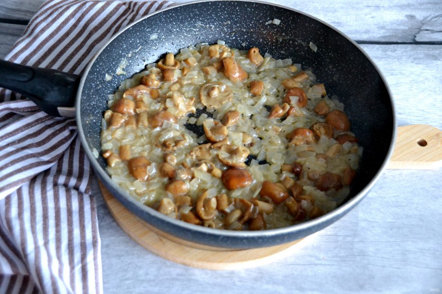 Добавьте к луку опята и обжарьте еще минут 5-10, посолите и поперчите.