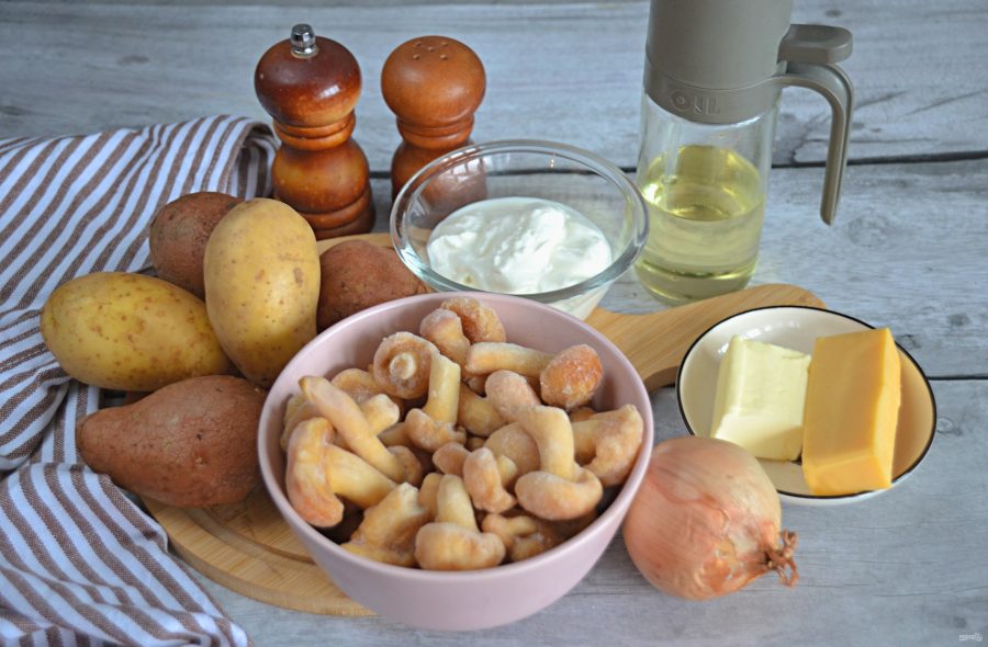 Сыр натрите на терке, смешайте с 2-3 ст. ложками сметаны, добавьте сухой или свежий чеснок по вкусу, выложите сверху на картошку с опятами. Запекайте при температуре 180 градусов 50-60 минут до готовности.