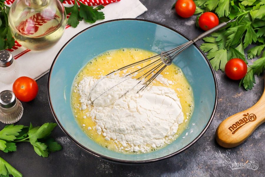 Всыпьте пшеничную муку высшего сорта и аккуратно вмешайте ее в массу, но не взбивайте, иначе получатся комочки. В зависимости от величины яйца вам может потребоваться чуть больше или чуть меньше муки.